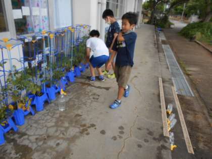 6月24日(金)今朝登校すると、強風のため1・2年生の鉢が倒れていました。みんなで教室側に寄せて移動させました。自分のだけでなく、友達のものまで進んで運ぶ2年生の姿にいいね!と感心しました。