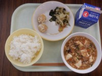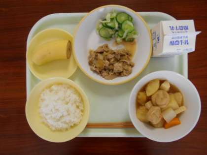 7月1日(金)の給食は、「ご飯、牛乳、豚肉のジャンロー、きざみ和え、炊き合わせ、バナナ」でした。