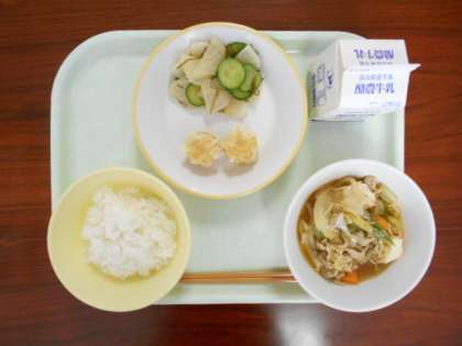 7月11日(月)の給食は、「ご飯、牛乳、韓国風すきやき、にんじんシューマイ、昆布和え」でした。