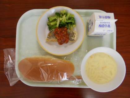 7月12日(火)の給食は、「コッペパン、牛乳、魚のチリソースかけ、ゆでブロッコリー、コーンポタージュ」でした。
