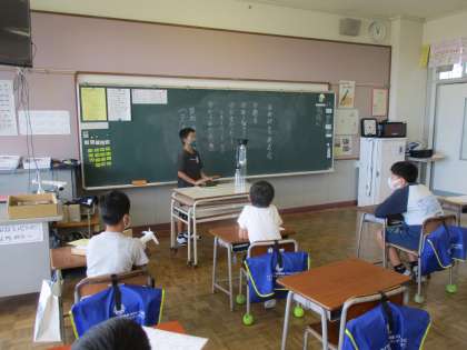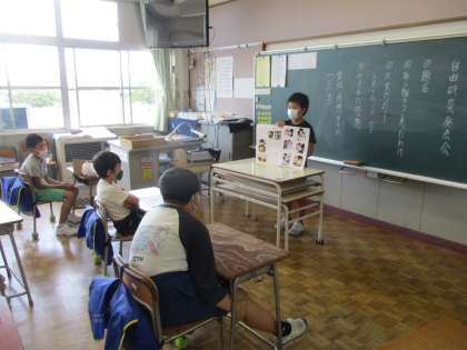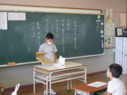 2学期がスタートしました。始業式の後、自由研究発表会をしました。工夫をこらした作品、時間をかけて完成したと思われる作品がそろいました。友達の発表を興味深く聞く子供たちでした。