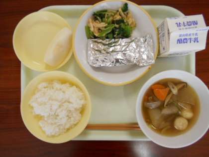 9月2日(金)の給食は、「ご飯、牛乳、鯖の銀紙焼き、はりはり和え、冬瓜とつみれのスープ、梨」でした。