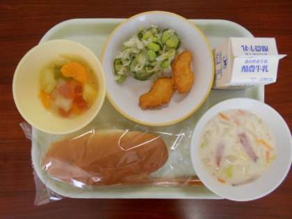 9月6日(火)の給食は、「コッペパン、牛乳、チキンナゲット、えごまドレッシングサラダ、白いんげん豆のクリームスープ、フルーツカクテル」でした。