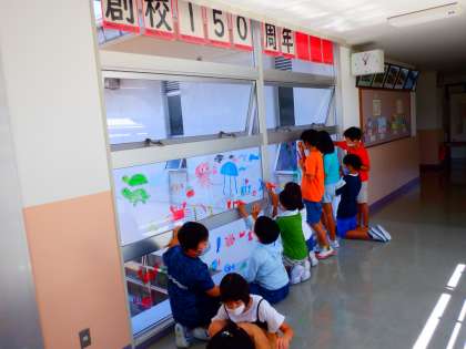 150周年を記念して、校内装飾のひとつで、窓に四方の海をテーマに描画しました。窓をキャンバスにすることがなかなかない子供たちは、新鮮な気持ちで絵を描き、お祝いの気持ちを高めました。