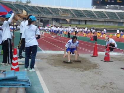 写真は、グループ毎に並んで最初の走り幅跳びに挑戦している様子です。