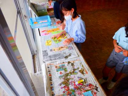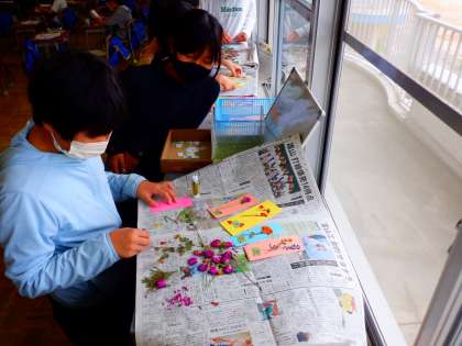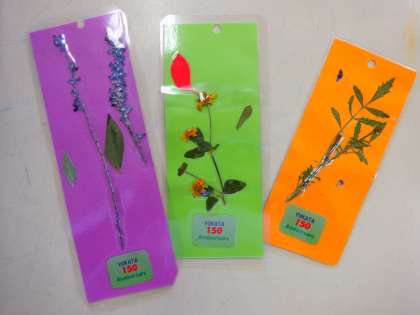 花壇の花を再利用して、150周年記念になるようなしおりを作成しました。全校や関係する人たちに配付する予定です。