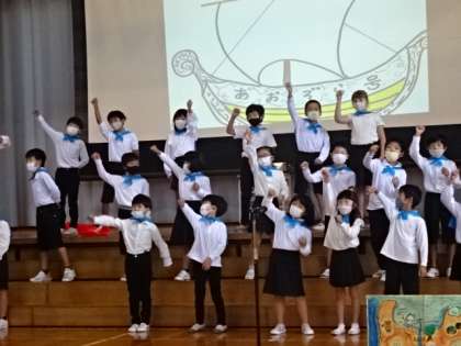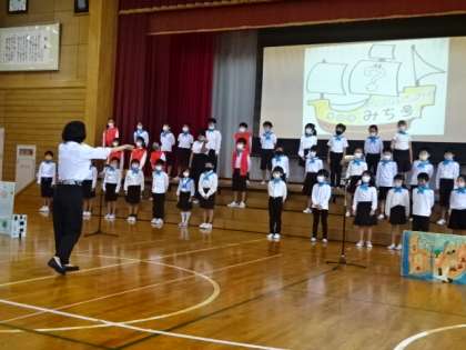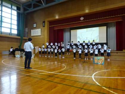 2・3年生の3時間目は、体育館で合唱の練習でした。二人の指揮者をしっかりと見ながら元気よく歌を歌っている2・3年生でした。
