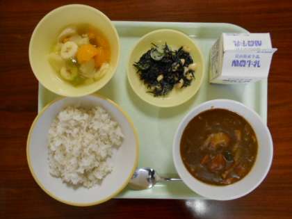 10月7日(金)の給食は、「麦ご飯、牛乳、食べキリンハヤシ、大豆とひじきのサラダ、フルーツゼリーミックス」でした。