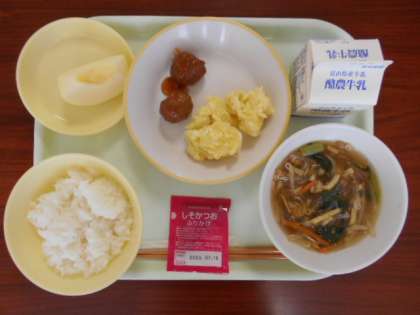 10月14日(金)の給食は、「ご飯、牛乳、ミートボール、チーズおさつ、春雨スープ、リンゴ、しそ鰹ふりかけ」でした。