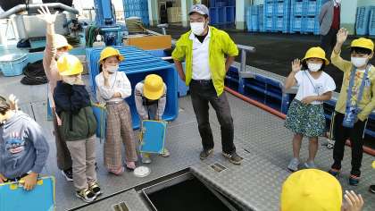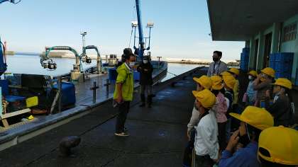 四方漁港では、漁師さんの話を聞いたり、船の上に乗ってみたりしました。