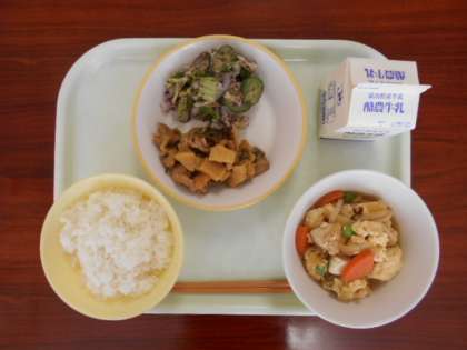 10月21日(金)の給食は、「ご飯、牛乳、あっさりチキン、ゆかり和え、厚揚げの錦とじ」でした。