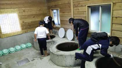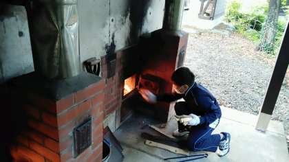 薪をくべて五右衛門風呂を沸かして入りました。温度の調節が難しそうでした。