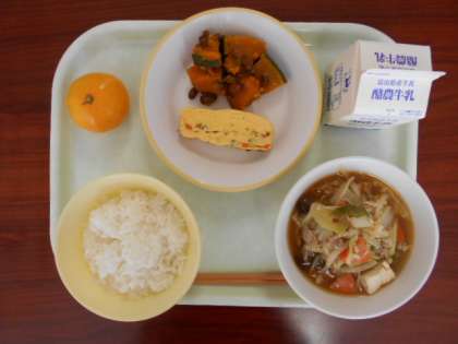 10月26日(水)の給食は、「ご飯、牛乳、千種焼き、カボチャのいとこ煮、白菜鍋、みかん」でした。