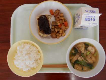 11月2日(水)の給食は、「ご飯、牛乳、魚の甘味噌かけ、五目煮豆、うすくず汁」でした。