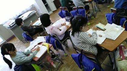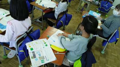 2年生の4時間目は、算数の学習でした。紙を2回折ってできた線を教科書やノートの角にあてながら、直角について学んでいました。