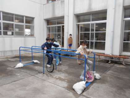 上:一輪車練習台で練習を積み重ねている四方っ子たち。とっても上手になっています。