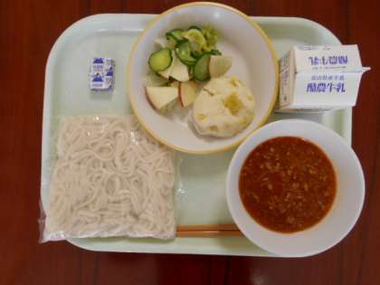 12月7日(水)の給食は、「ソフト麺とミートソースかけ、牛乳、白菜とリンゴのサラダ、蒸しパン、ポケットチーズ」でした。