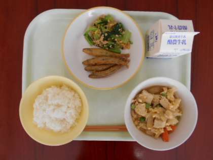 12月8日(木)の給食は、「ご飯、牛乳、きびなごの唐揚げ、納豆和え、親子煮」でした。