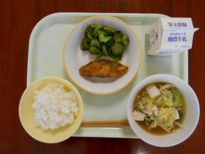 12月14日(水)の給食は、「ご飯、牛乳、ふくらぎのみぞれがけ、とろろ昆布和え、白菜鍋」でした。