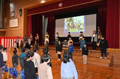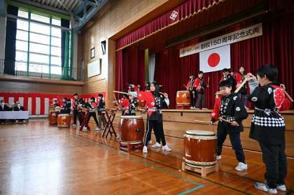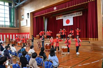 全校でビリーブを歌っているところ、4年生による祝い太鼓、5年生による祝い太鼓の様子です。式典には、多くの方々に参加していただきました。本当にありがとうございました。
