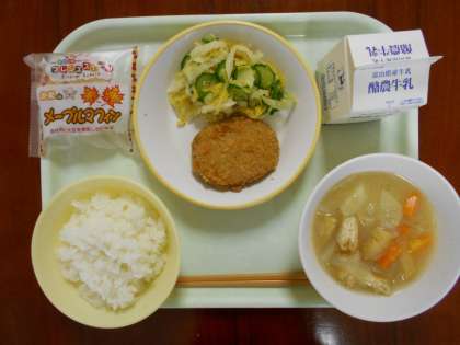 2月10日(金)の給食は、選択献立でした。「ご飯、牛乳、◆豚肉の竜田揚げか肉じゃがコロッケ、合わせ和え、味噌汁、○メープルマフィンかいちごのシュークリーム」でした。