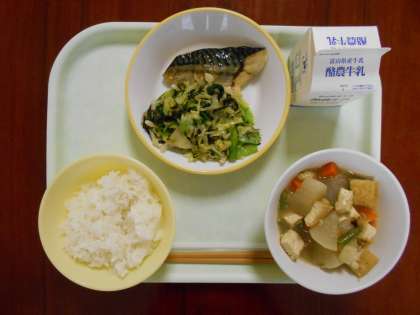 2月13日(月)の給食は、「ご飯、牛乳、鯖の塩焼き、磯和え、大根と厚揚げの中華煮」でした。