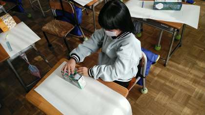 2年生の2時間目は、算数科の学習でした。自分の持ってきた箱の面の形を紙にうつしとっていました。