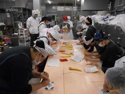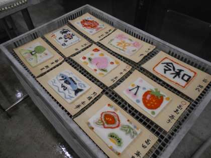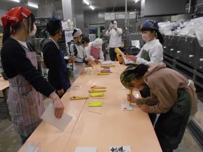 四方蒲鉾さんで卒業記念の蒲鉾つくりを行いました。「祝」や卒業をイメージする図柄を描きました。どれも力作揃いで、完成が楽しみです。