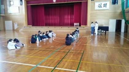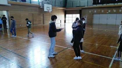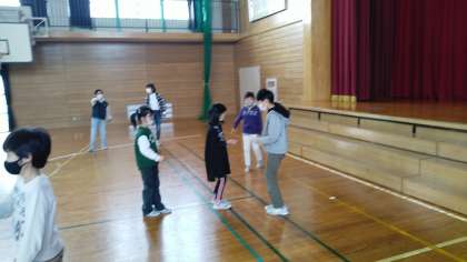 生き生きタイムの時間に体育館で2年生と6年生が一緒に遊んでいました。床の線の上を歩いて、ぶつかったらじゃんけんをしていました。