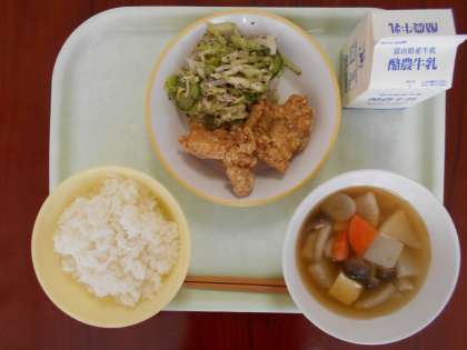 3月9日(木)の給食は、「ご飯、牛乳、鶏肉の竜田揚げ、ゆかり和え、けんちん汁、のり佃煮」でした。