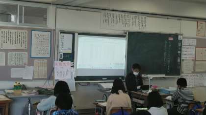 5年生の5時間目は、国語科の学習でした。デジタル教科書を使って、大造じいさんとガンの朗読を聞いていました。