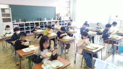 2〜6年生は、今日から給食が始まりました。4〜6年生は、準備も手際よく行っていました。