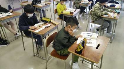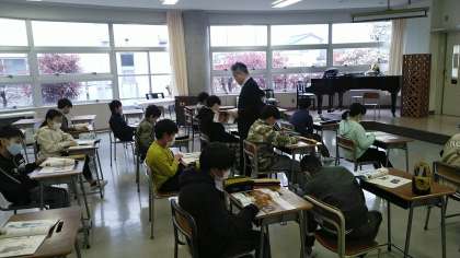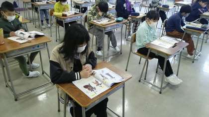 5年生の4時間目は、音楽の学習でした。今年学習する音楽の内容を確認していました。