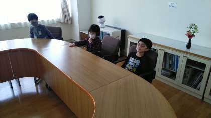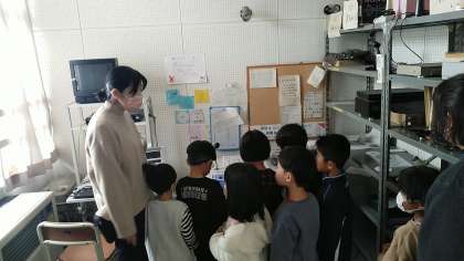 5時間目に、1年生は、学校探検をしていました。放送室の中を見学したり、会議室の椅子に座ってみたりしていました。