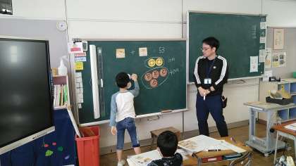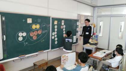 2年生の2時間目は、算数の学習でした。今日もお買い物をしながらたし算を考えていました。今日は、先生に頼まれたチョコレートと自分のほしい物を買う計算について考えていました。