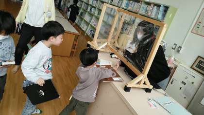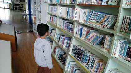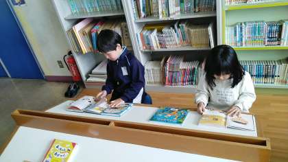 4時間目に1年生は、図書ラウンジに本の交換にきていました。自分の読みたくなる本を見付けると貸し出ししてもらってすぐに読んでいました。
