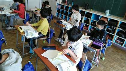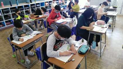 5年生の2時間目は、社会科の学習でした。日本地図をノートに描いて、面積について考えていました。