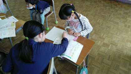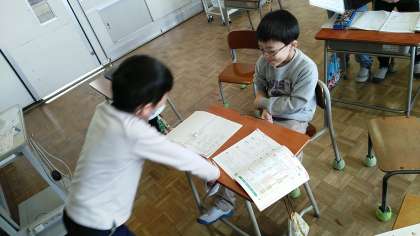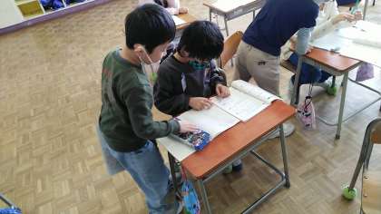 2年生の1時間目は、算数の学習でした。引き算のひっ算の練習問題に取り組んでいました。全部で25問。早く終わった子供は、まだ終わっていない友達にやり方を教えていました。