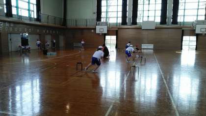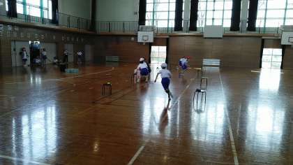 5年生の5時間目は、体育の学習でした。体育館で運動会の巧緻走の練習をしていました。