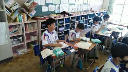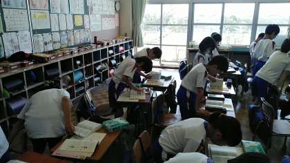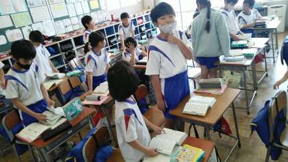 4年生の1時間目は、国語の学習でした。漢字辞典で漢字を見付ける練習を友達と競いながら行っていました。