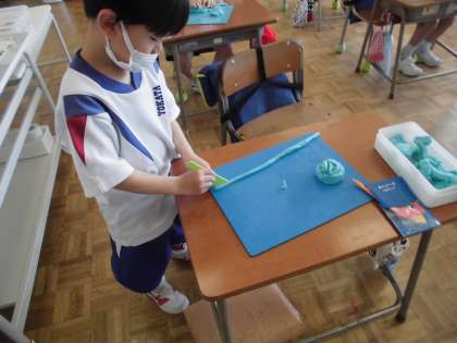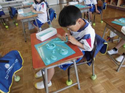 図画工作科「ひもひもねんど」では、ねん土をひものように伸ばして作品をつくりました。ラーメンやヘビ、アルファベット等、子供たちはねん土の特性を上手く生かしてつくっていました。