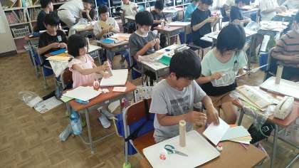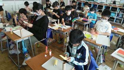 4年生の2時間目は、図画工作科の学習でした。筒やカラー片面段ボール紙等を使って、ビー玉が転がるコースを考えていました。