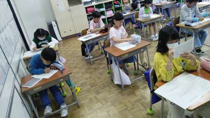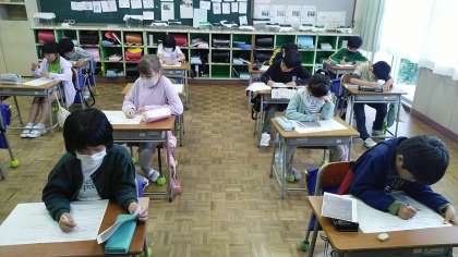 3年生の4時間目は、総合的な学習の時間でした。岡田先生にインタビューしたことをプリントにまとめていました。岡田先生のすてきなところをたくさん見付けている3年生でした。