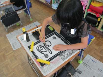 用具の名前を覚え、机の上に正しく置きました。筆に慣れるため、直線や曲線をかいてみました。気持ちを落ち着かせながら、きちんとと取り組むことができました。