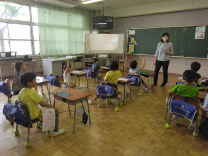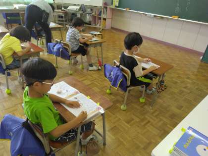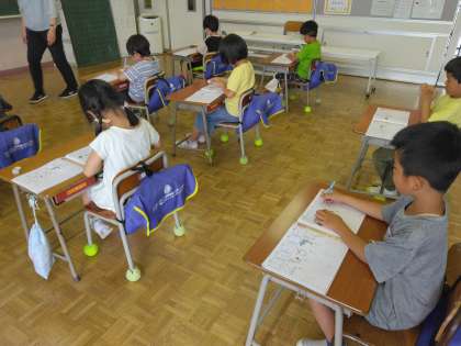 1年生の5時間目は、ひらながの学習でした。お手本の字をはみ出さないようになぞったり、書くときの姿勢を確かめたりしながら、一生懸命に書いていました。