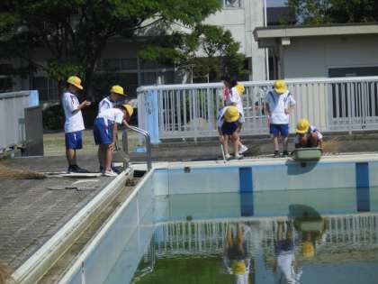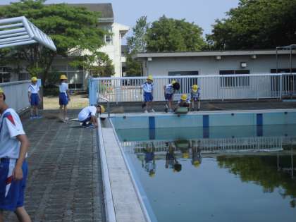 4年生の1時間目は、再来週のプール開きに向けて、プールの溝を清掃しました。土や落ち葉等たくさんありましたが、クラスのみんなと協力して作業を進めていました。