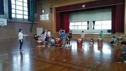 5年生の2時間目は、和太鼓指導の時間でした。講師の先生に教えてもらいながら力強く太鼓を叩いていました。