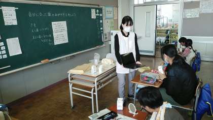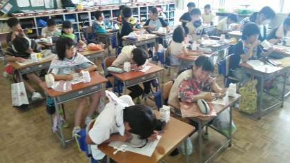 4年生の2時間目は、養護教諭による歯磨き指導の時間でした。染めだしをしながらよい歯の磨き方について考えていました。