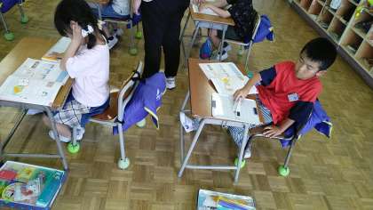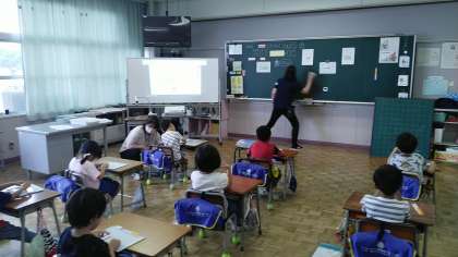 1年生の5時間目は、算数の学習でした。白色と黒色のウサギの絵の上にブロックをおいて足し算を考えていました。