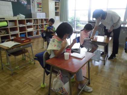 1年生の2時間目は、保健室の先生から、歯みがきの大切さや歯みがきの仕方について教えていただきました。染め出し液を使って歯の汚れを確認すると、歯をきれいにしようと鏡を見ながら一生懸命に磨いていました。